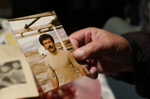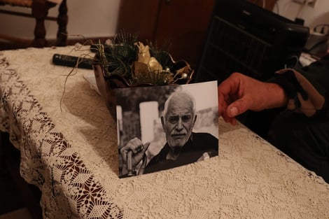 A man places a portrait I took in 2007 on the table at the house of the now deceased sitter's brother, Western Crete, 2017, Photo by K Kalantzis.