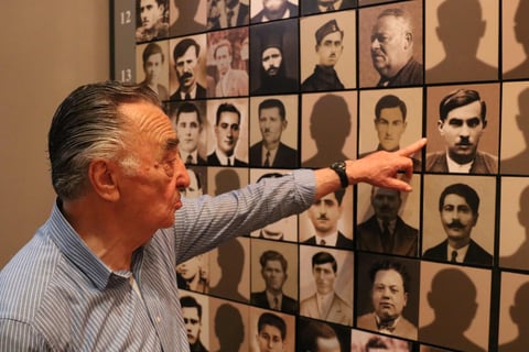 Giorgos Dimopoulos showing me the portrait of his father on the photo wall of victims of the 1943 civilians' slaughter by the Wehrmacht at the "Municipal Museum of the Kalavryta Holocaust'', 2018, Photo by K Kalantzis.
