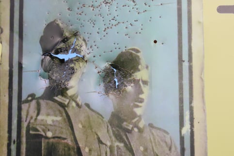 Close-up of road sign advertizing a historical collection of objects from WWII with bullet holes, Western highland Crete, 2017, Photo by K Kalantzis.