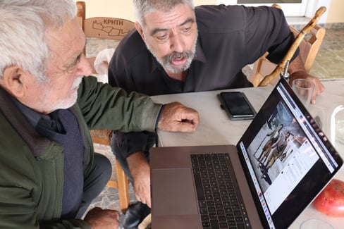 Manousos Nikiforakis and Leonidas Katsanevakis discussing an archival photo of covillagers (western highland Crete) from the 1950s posted on Facebook, 2018, Photo by K Kalantzis.