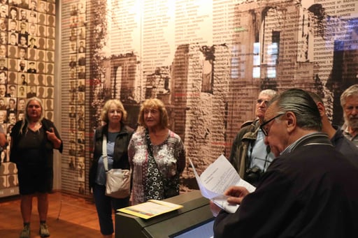 Visitors from Austrian at the "Municipal Museum of the Kalavryta Holocaust" listening to a presentation by survivor Giorgos Dimopoulos, 2018, Photo by K. Kalantzis
