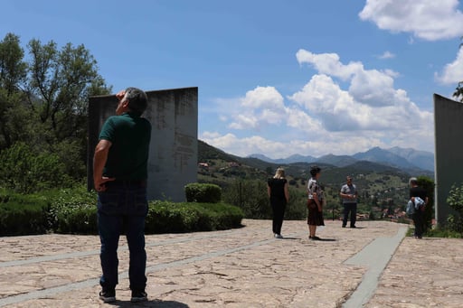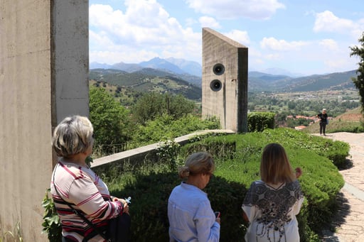 Visitors pause and engage the memorial for the victims of the Kalavryta slaughter, 2018, Photo by K. Kalantzis.